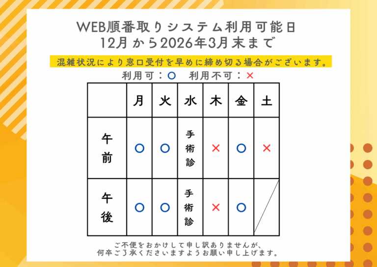 ・WEBで順番を取られた時点では、受付が完了していません!必ず窓口受付時間終了までには院内窓口受付にて受付をお済ませください。窓口受付終了後は自動キャンセルとなります。